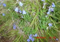 避難小屋前を通過 直ぐ上が槍ケ鞘のシェルターのある地点。火山爆発時の避難小屋であるが、外形的には金属製の山小屋。林を脱すると前方に高峰が立ちはだかり、噴火のためか右側は深く切れ落ちている。目指す山は目の前の岩峰か、それともその左の頂か。既にガレ場の登山道には多くの男女が取り付いている。我々も、気を引き締めてガレ場へ踏み出した。花が紫色の高山植物に出会う。後にヒメシャジンと知った。岩石を避けながら一歩一歩上がる。トップに上がったが前方には雲が立ちこめて展望はない。