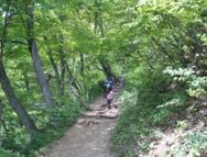 山頂へ 意外に急坂の尾根道を進んで、ようやく頂上(634m)。登山口から1時間30分であった。小さな山頂には奥社があって、多くのハイカーというよりは家族連れが弁当を広げている。小社に登頂御礼をし、下りのご加護をお願いする。5分の休憩とし、周囲を眺め、昼食を頬張った。日本海の海岸線は確かめられるが、遠望は利かない。