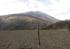 峰の茶屋から馬返しへ 右手に回り込み坂を上がると、浅間山への分岐、馬返しに着く。現在は浅間山への登山道は立ち入り禁止中。私は反対側の小浅間山への標識を確かめ、いよいよ登山道である。ガイド通り、火山灰に覆われたザレ場で、道も薄く、草木も下になった。いつものように一歩、一歩慎重に上がり続ける。右手に遠望する山並みは八ヶ岳と蓼科山か。振り向くと、大浅間山。活火山は黒色一色で、未だ雪は見えない。一息入れて、また歩き出す。先程来、靴跡があり、それも新しいように見える。トラバース状の道を進み、頂端を回り込むと頂上であった。僅か50分で、コースタイムより僅かに遅いだけで、私には大順調。
