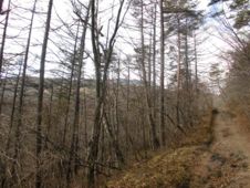 バスを登山口峰の茶屋に降り、登山カードに記入しスタート。義姉に貰った重い土産は、繁みの陰に置いた。歩きやすい一本道で、雑木林は全て葉を落とし、初冬である。深い山中で、ハイカーもなく、単身では寂しい位だが、黙々と行く。少し傾斜が増し、左手樹林の間に浅間山が見え出し、カメラを出したが、シャッターチャンスが難しい。